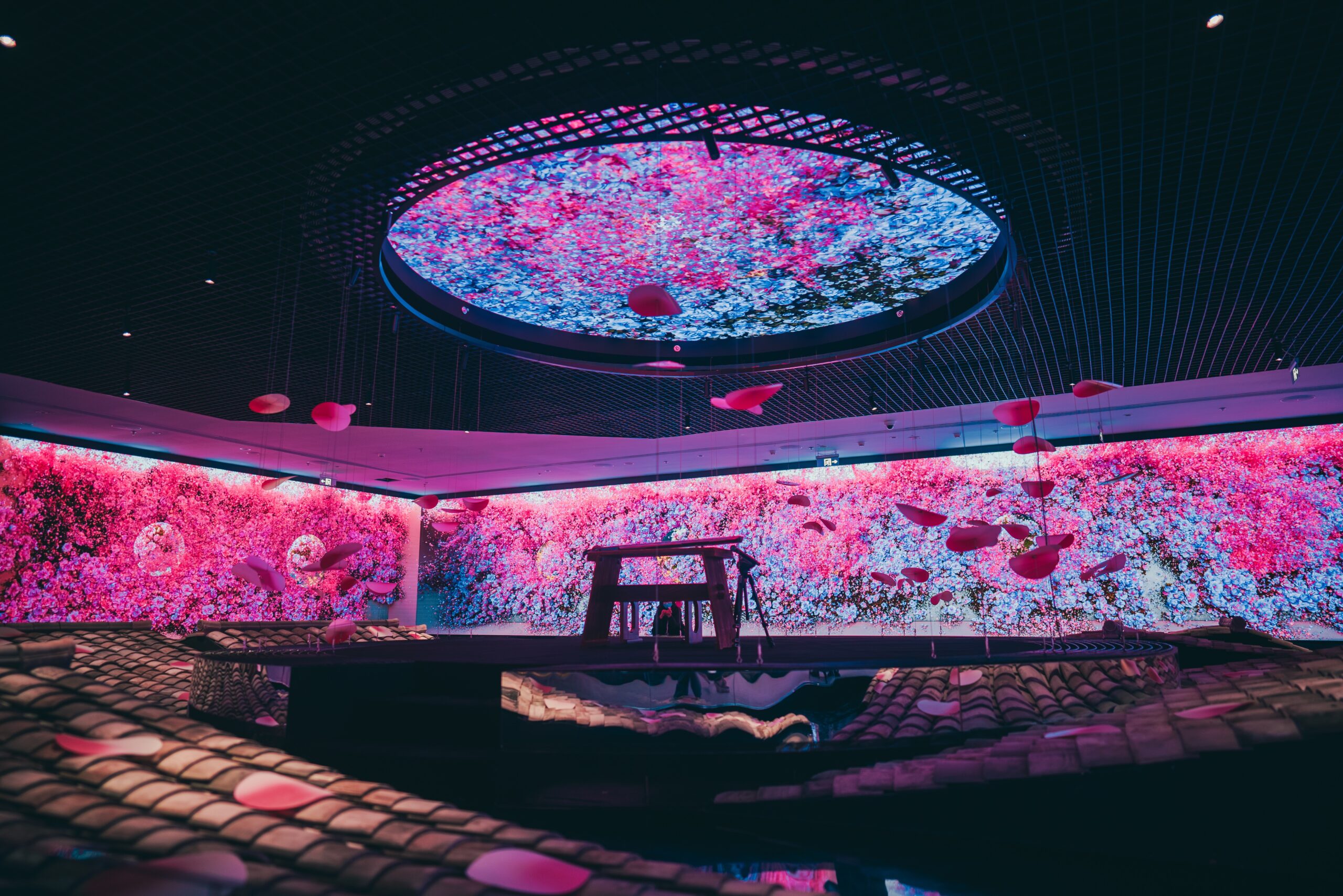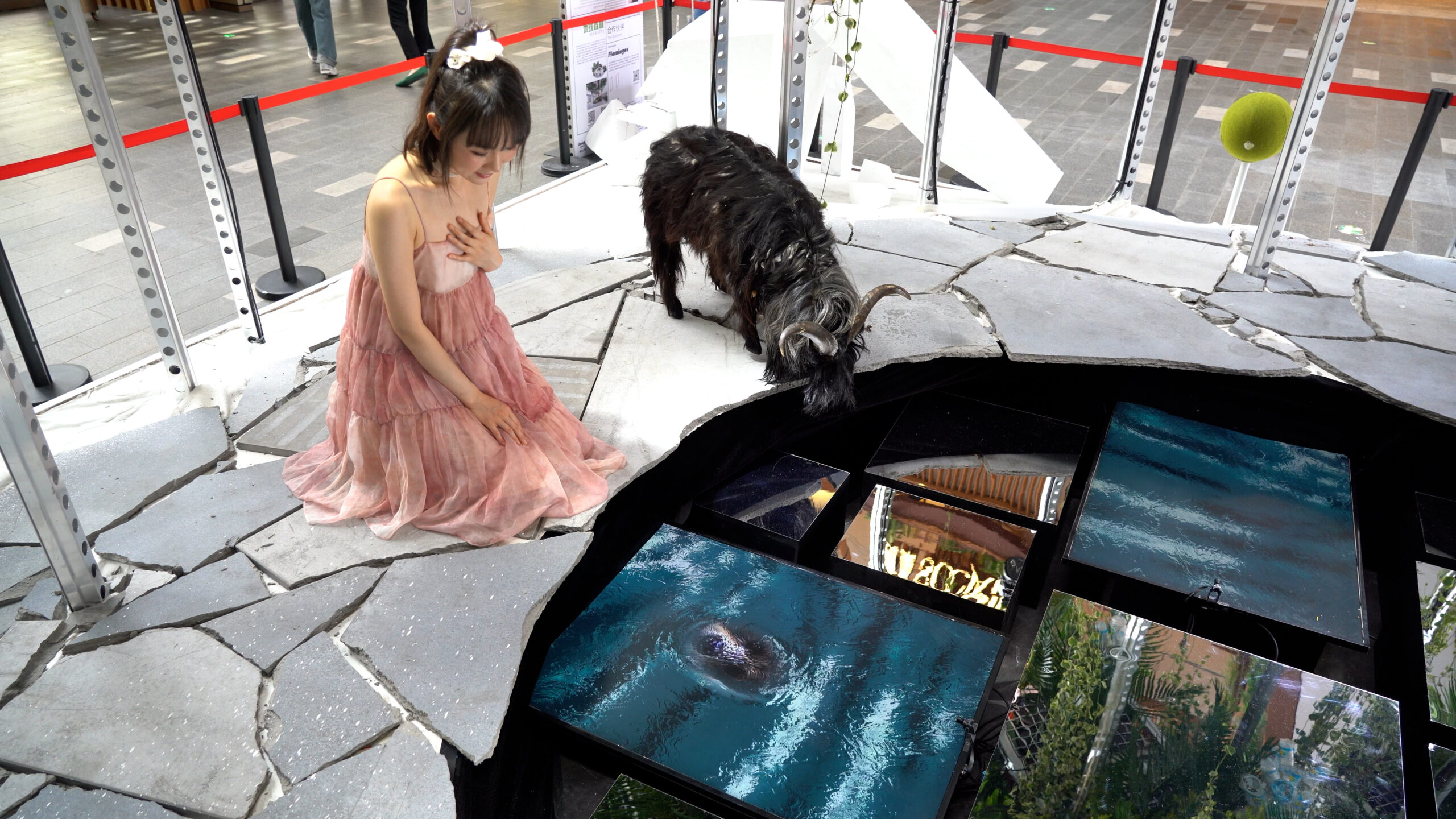 In the middle of a shopping center, visitors enter a forest within an urban environment, a fully immersive scenario of conflict and drama. Walking along the path built on the "architectural ruins", visitors come to a digital fountain at the centre, made up of both screens and mirrors.  Three screens of different sizes simulate a water surface, while the mirror reflect the reality around the visitors.