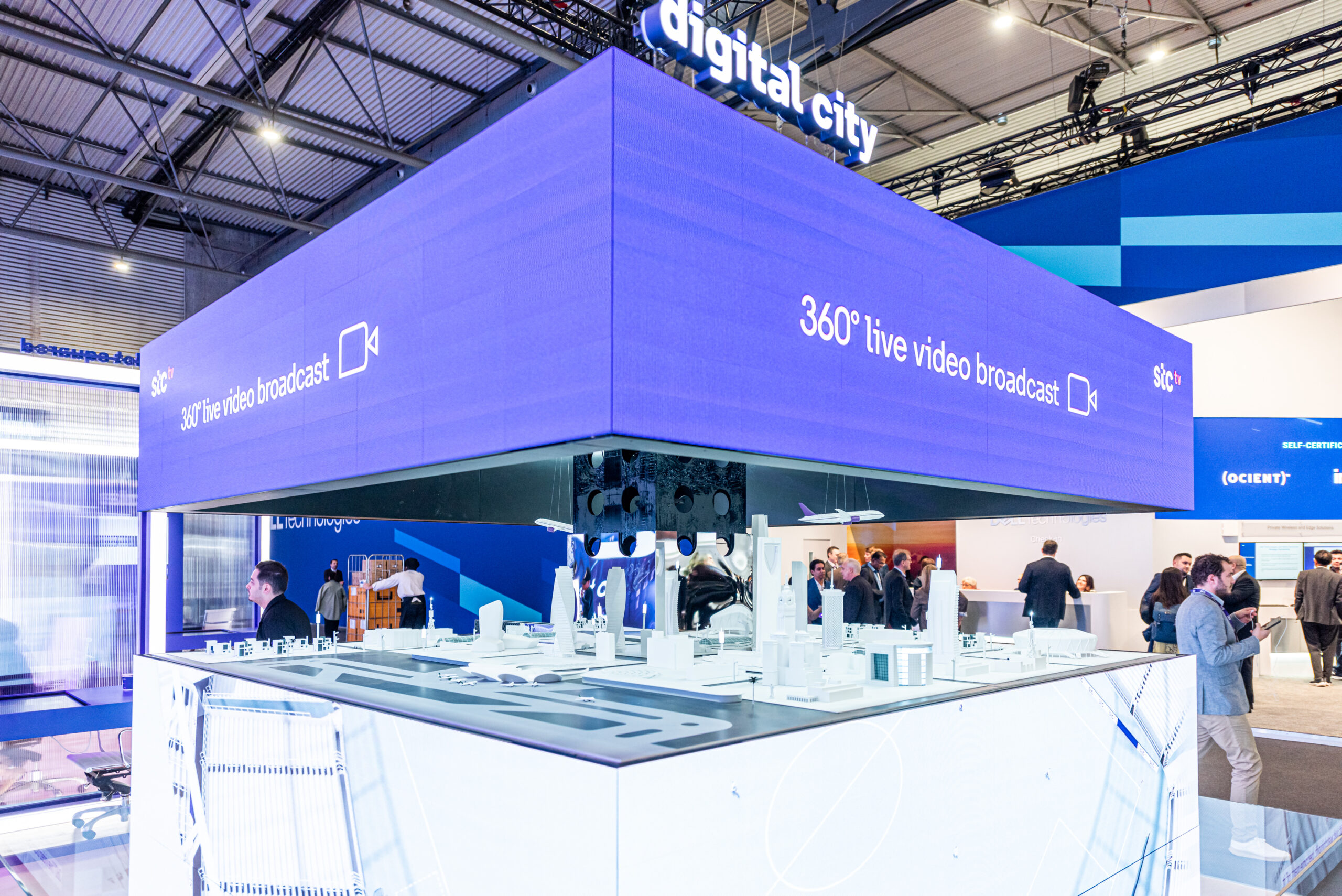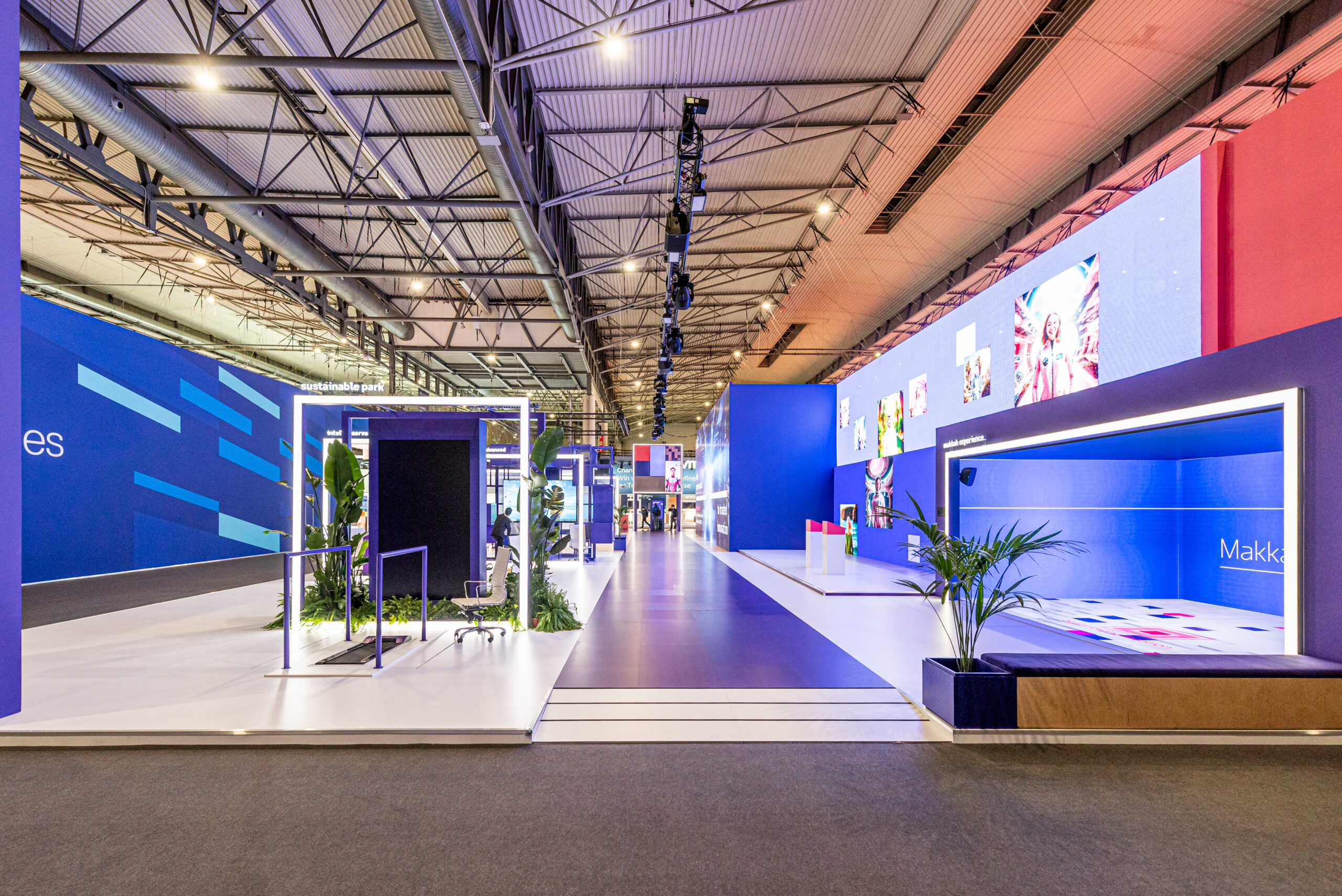 Additionally, the setup includes various subsidiaries of stc, each located at individual spots in front of the booth, where visitors have the opportunity to explore the world of stc via a treadmill or an interactive bicycle.