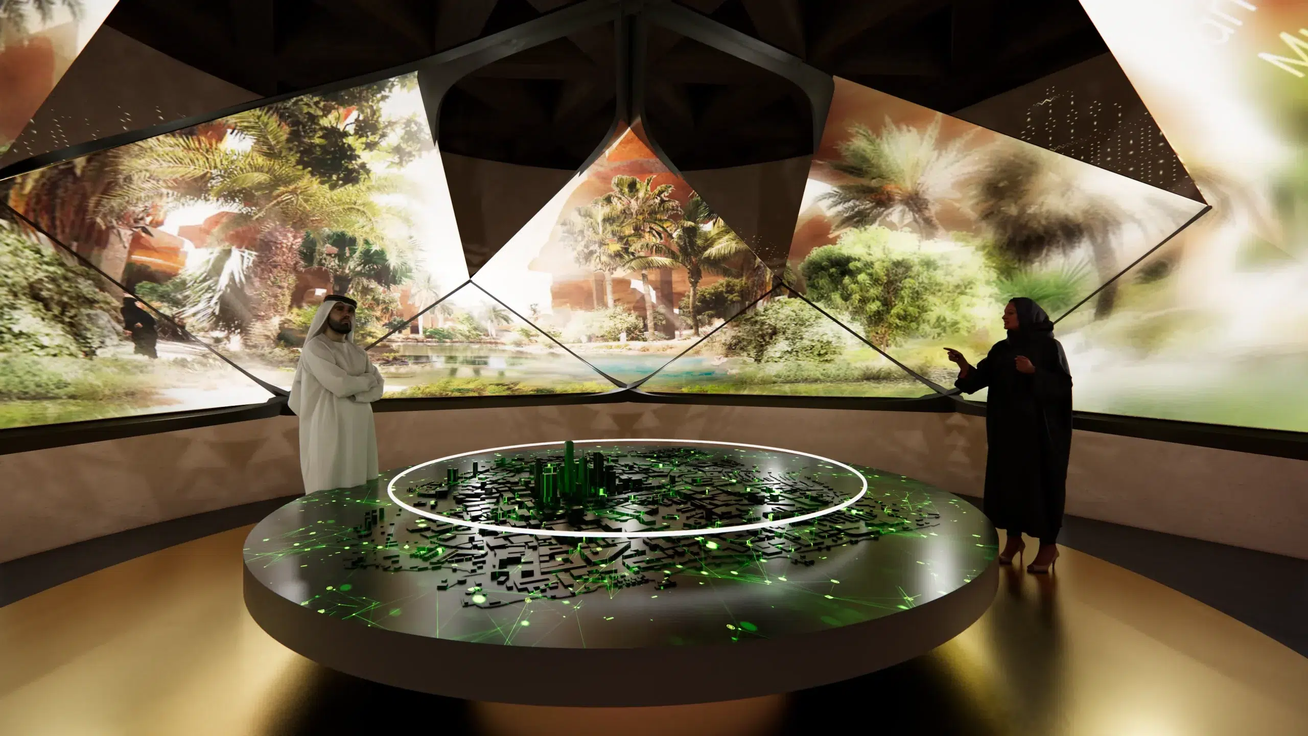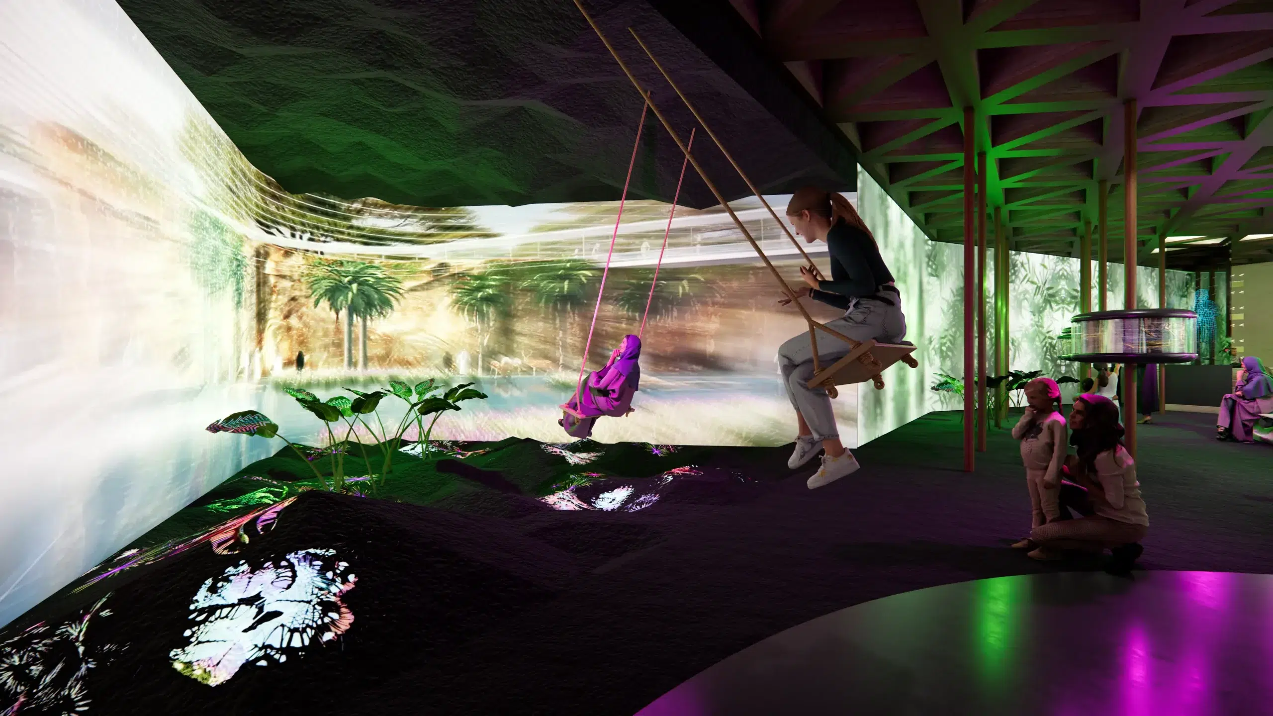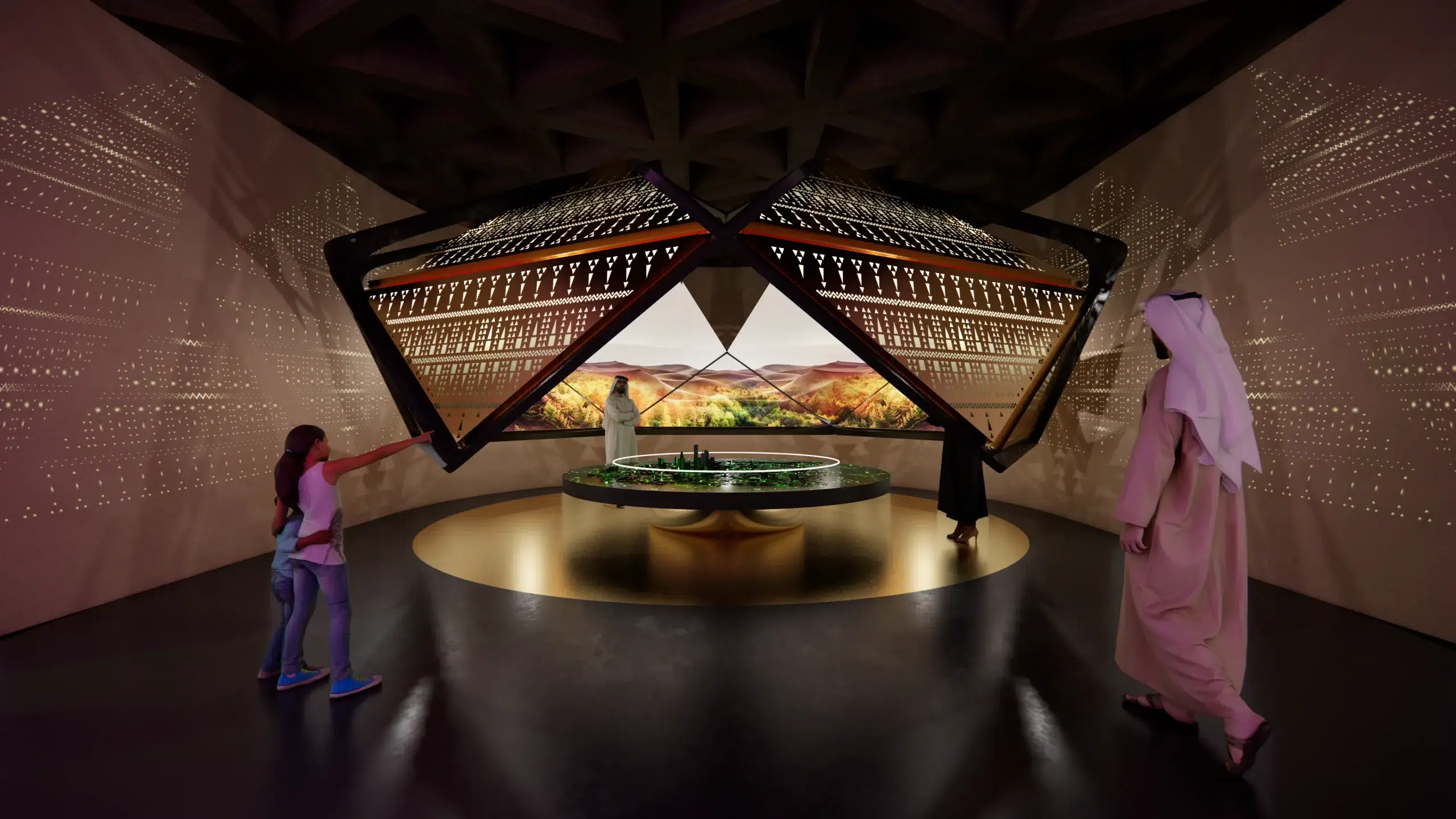 Visitors are welcomed into an immersive lobby that transports them into an oasis within the desert, a spatial storytelling experience that blends light, texture, and sound to express the miraculous transformation from arid land to flourishing greenery. It sets the tone for the journey ahead: contemplative, ambitious, alive.