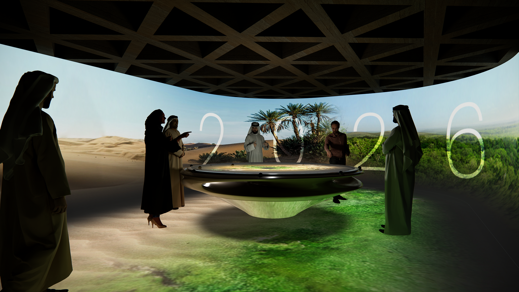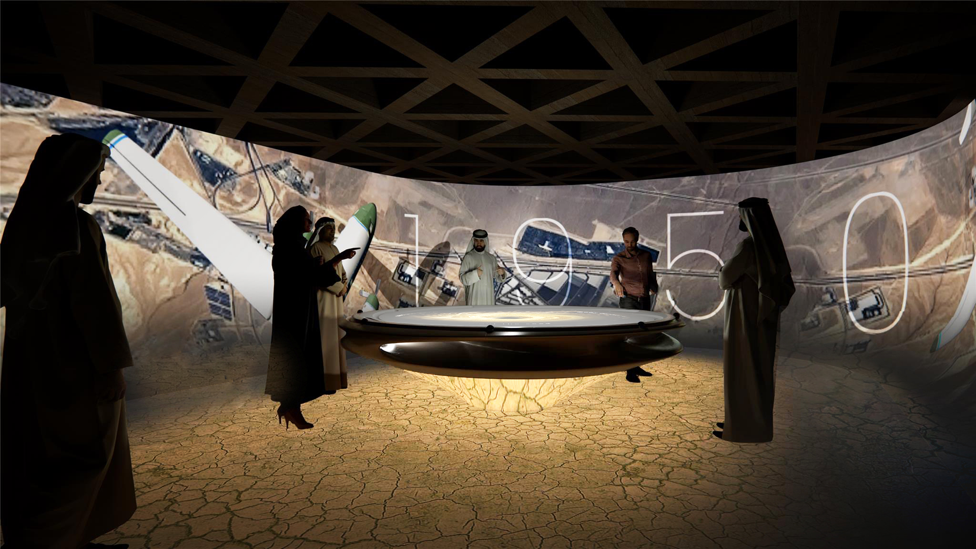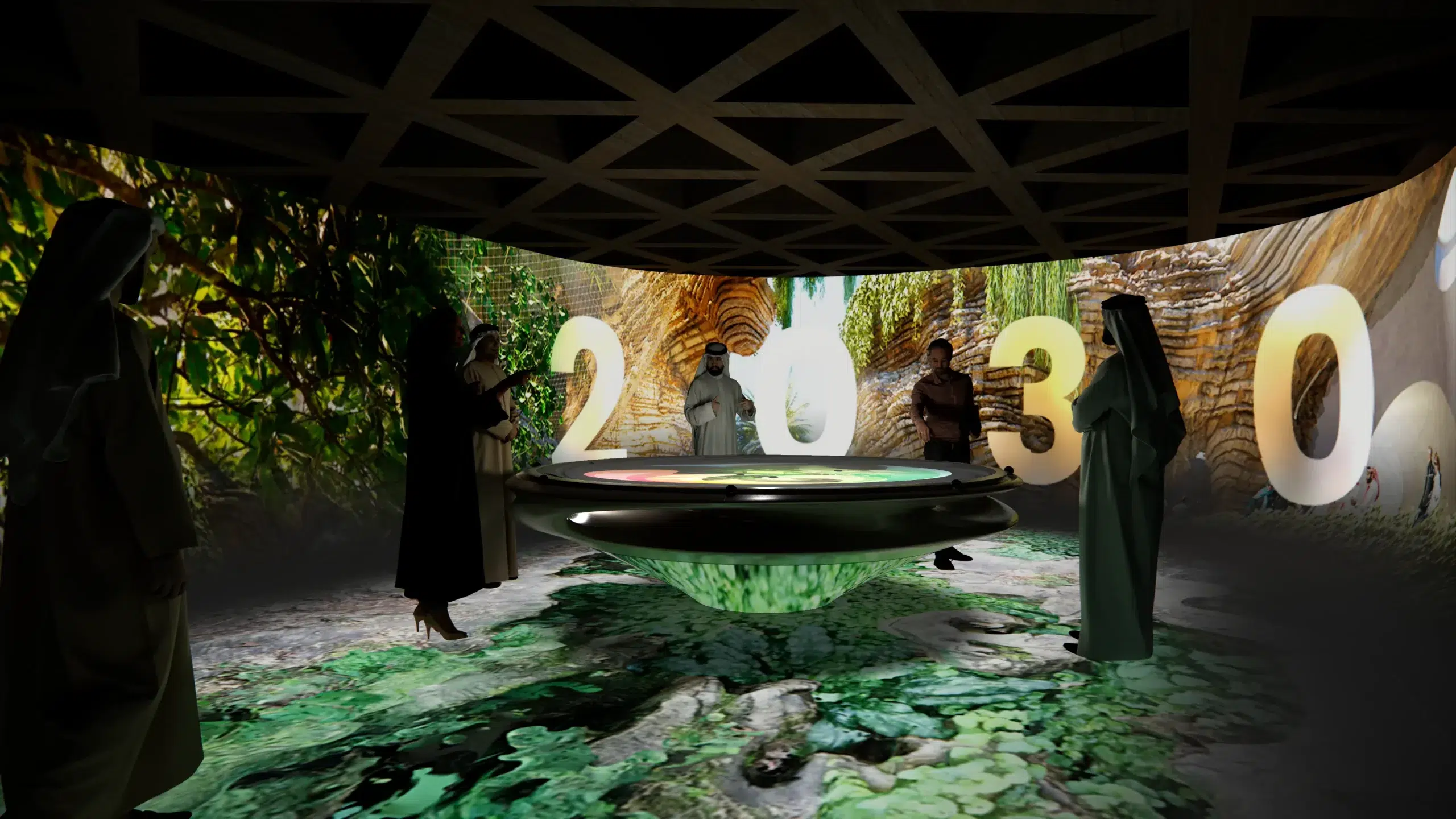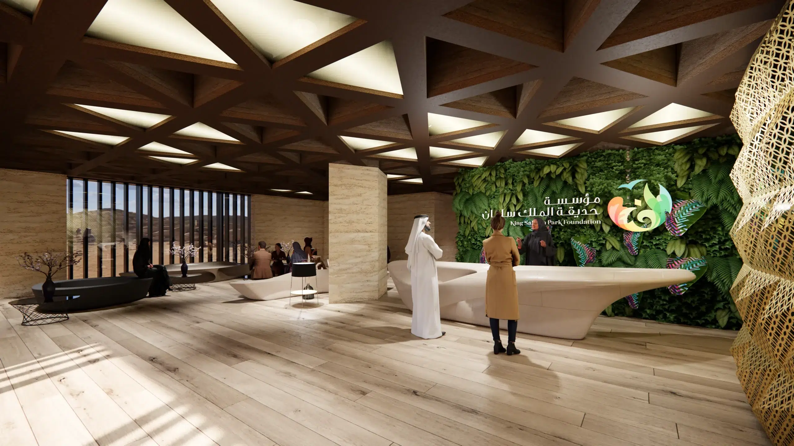 Visitors are welcomed into an immersive lobby that transports them into an oasis within the desert, a spatial storytelling experience that blends light, texture, and sound to express the miraculous transformation from arid land to flourishing greenery. It sets the tone for the journey ahead: contemplative, ambitious, alive.