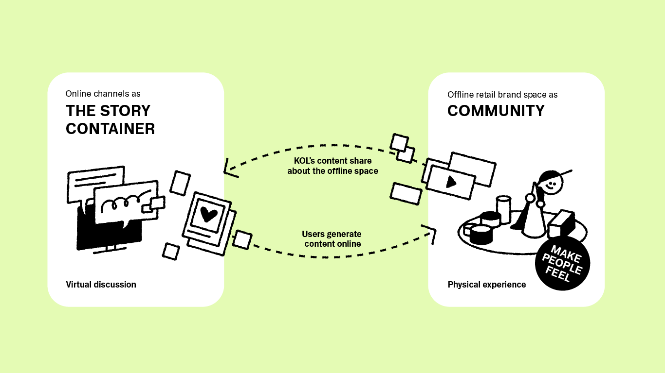 We view online channels as dynamic story containers, enhancing physical experiences. Virtual discussions sparked by KOL and user- generated content can create a seamless feedback loop between the different channels. Offline spaces in return become vibrant hubs for community and interaction, generating shareable content that extends their impact far beyond the store. We don’t only design offline retail spaces, but a holistic, interconnected online to offline to online (O2O2O) retail ecosystem.