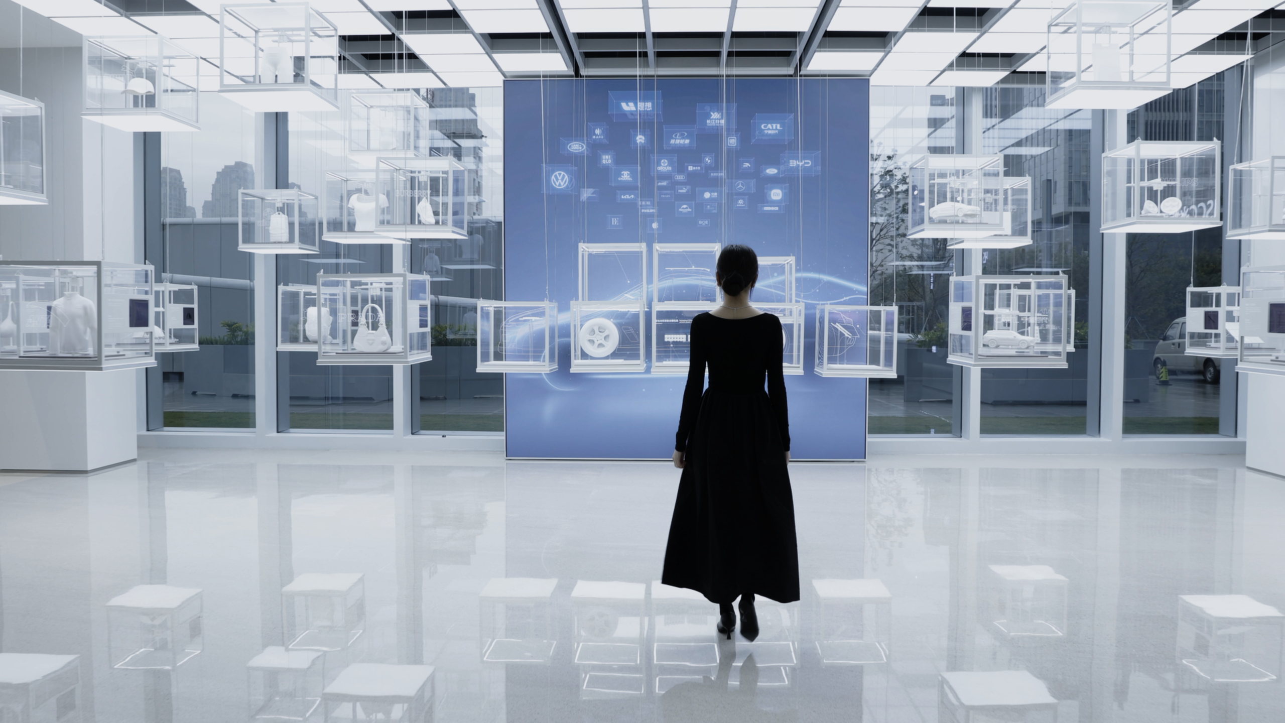 As the theater’s performance draws to a close, the boxes come together to form a car, highlighting Highsun’s innovations and contributions to the automotive industry. As the boxes lower, interactive screens on 10 of them provide visitors with detailed information on the materials and their applications, inviting them to pick up the knowledge they want to explore further, rather than passively receiving it.
