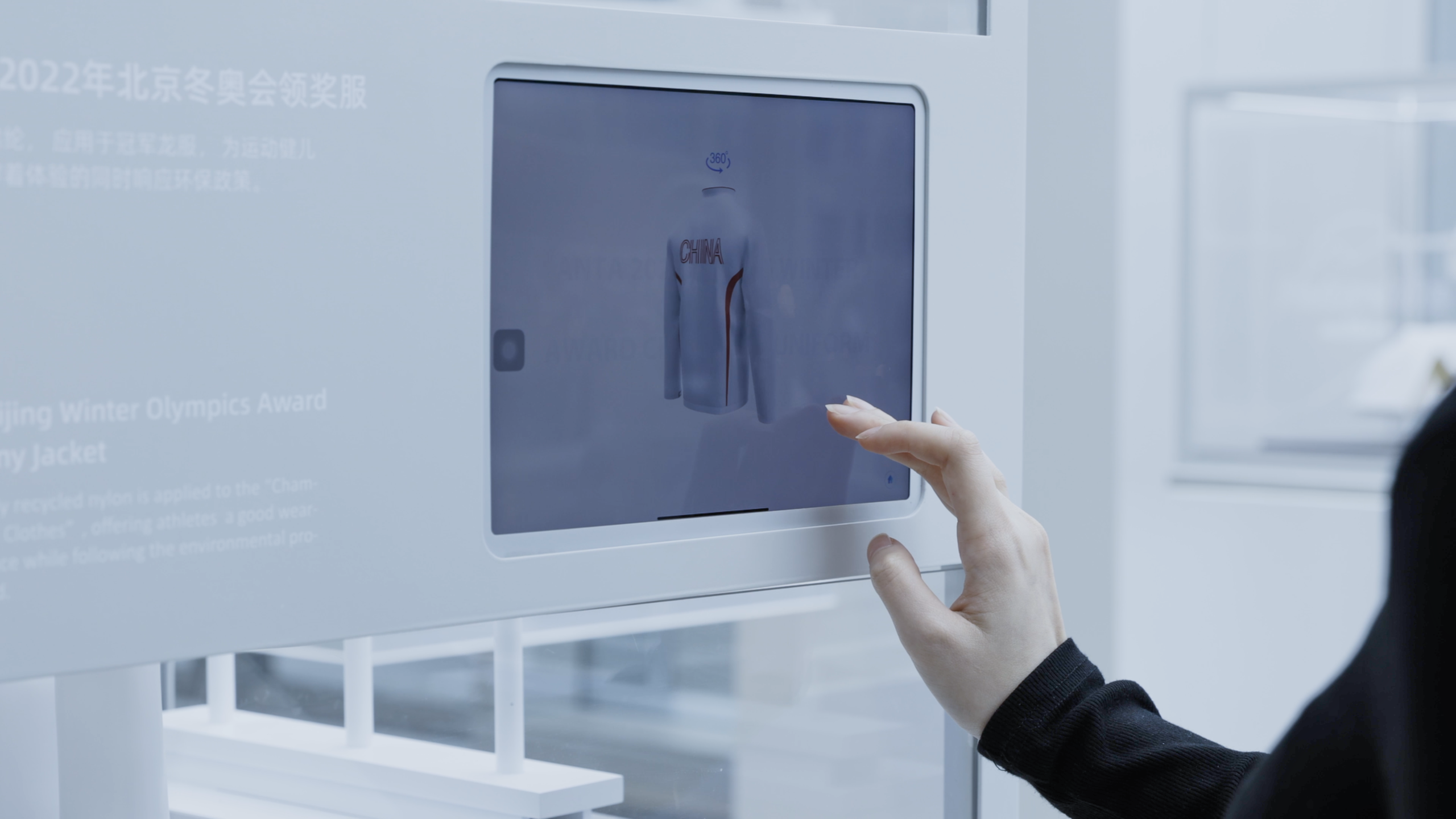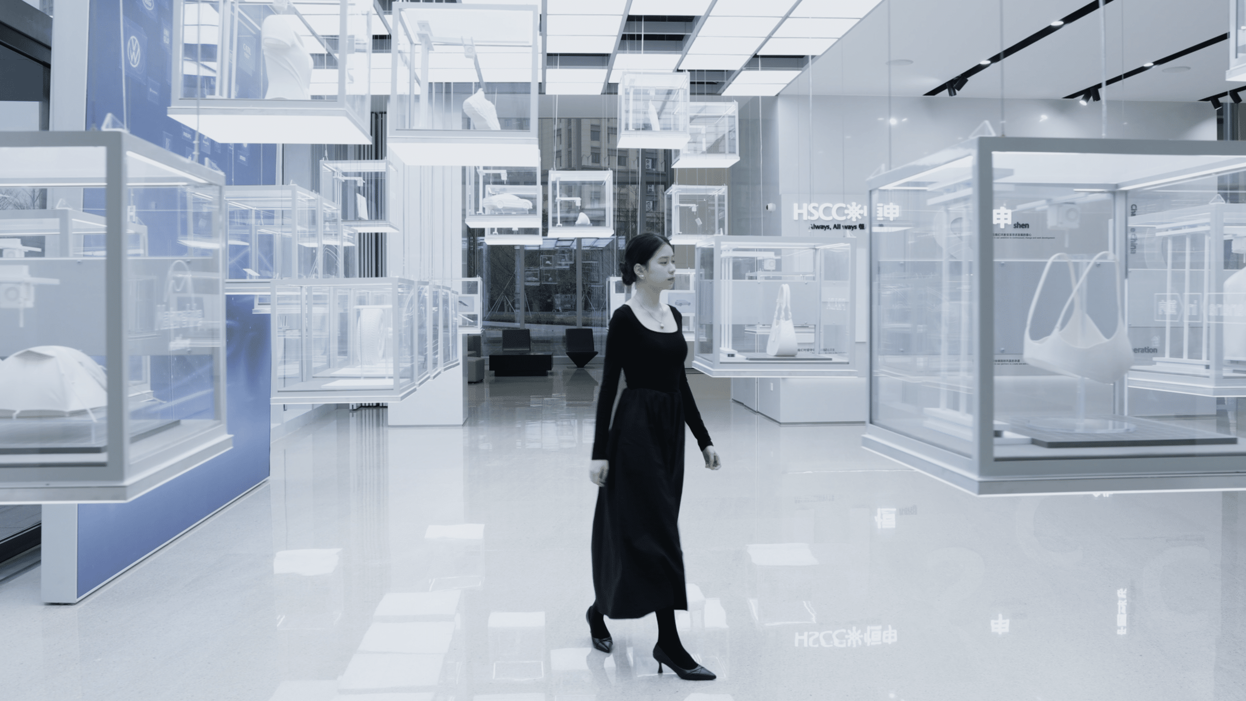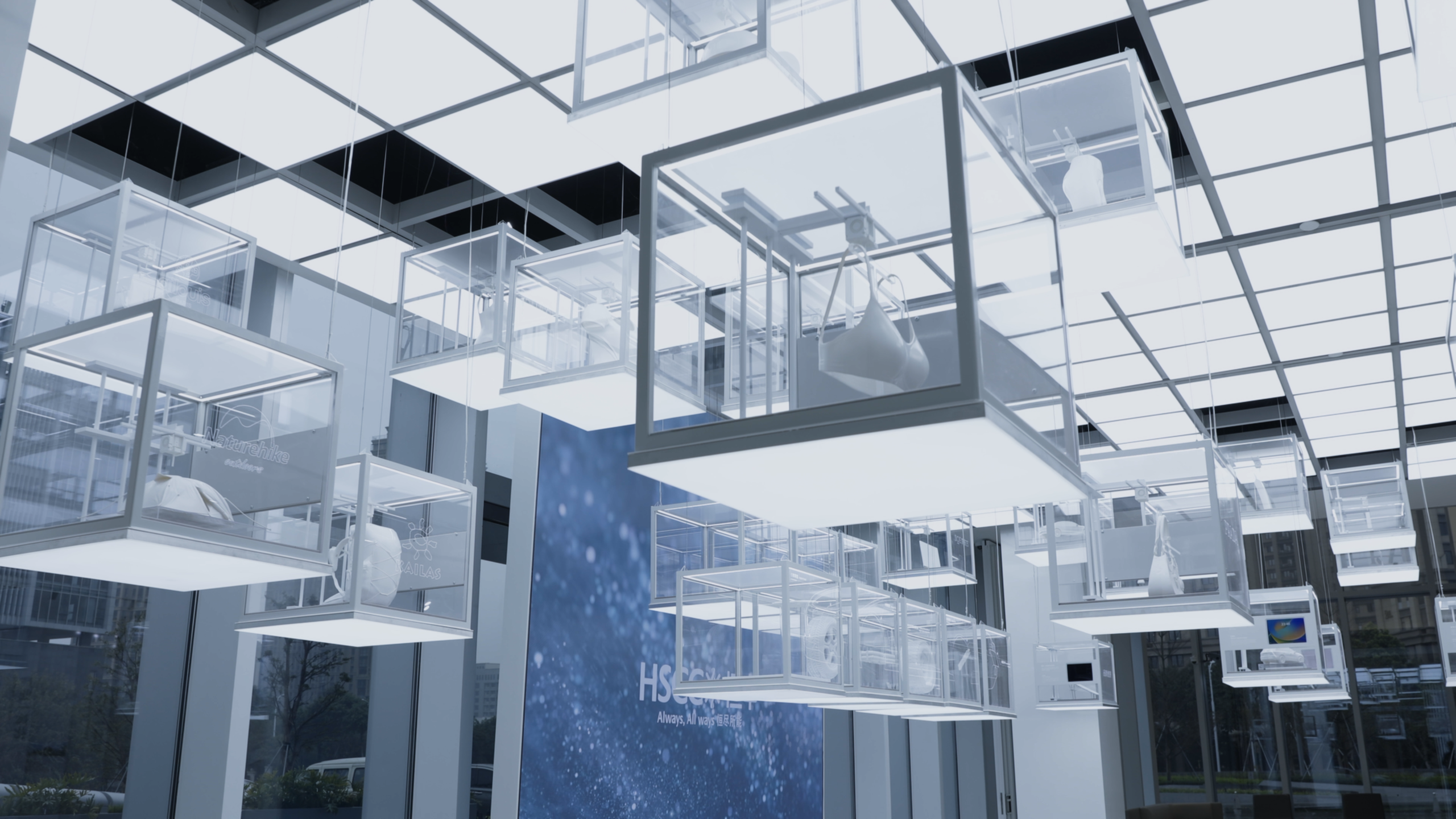 Matching the multimedia screen content, 32 raisable boxes hidden in the ceiling rise and fall. Inside each box is a 3D-printed model of an end-use product made primarily from nylon 6 and other new materials developed by Highsun. The rhythmic movement of these dynamic installations captures visitors’ attention, encouraging them to consider the vast applications of these products.