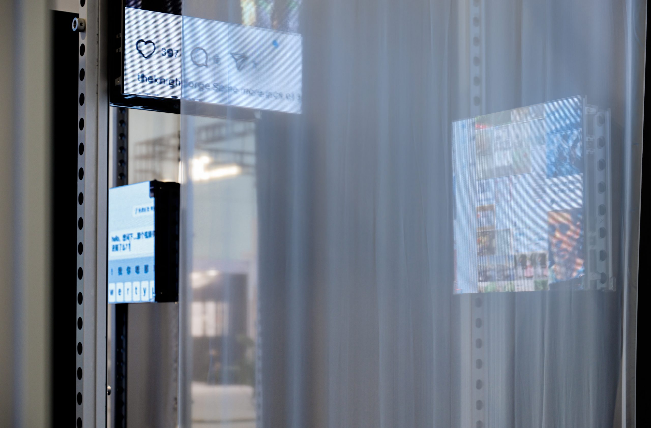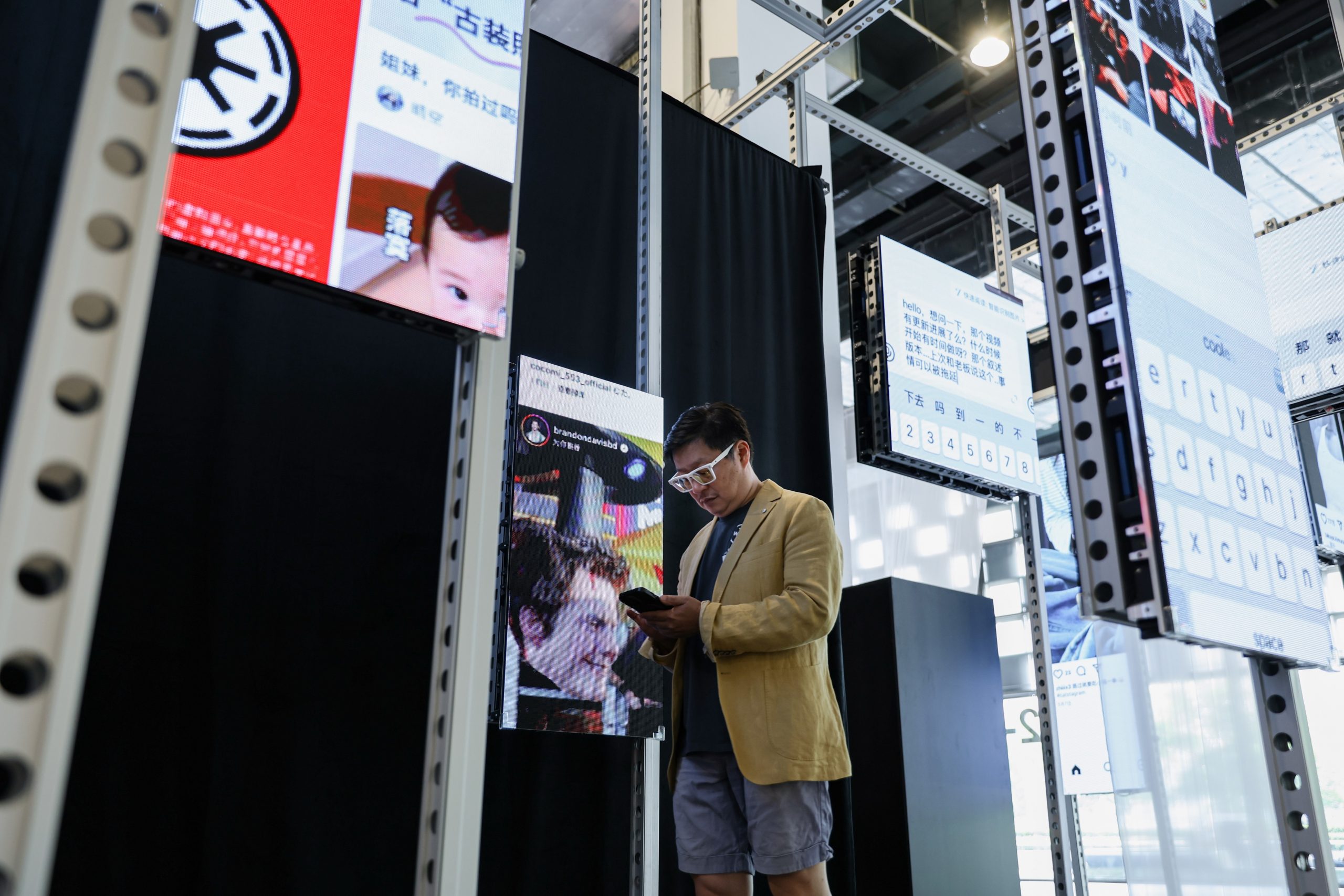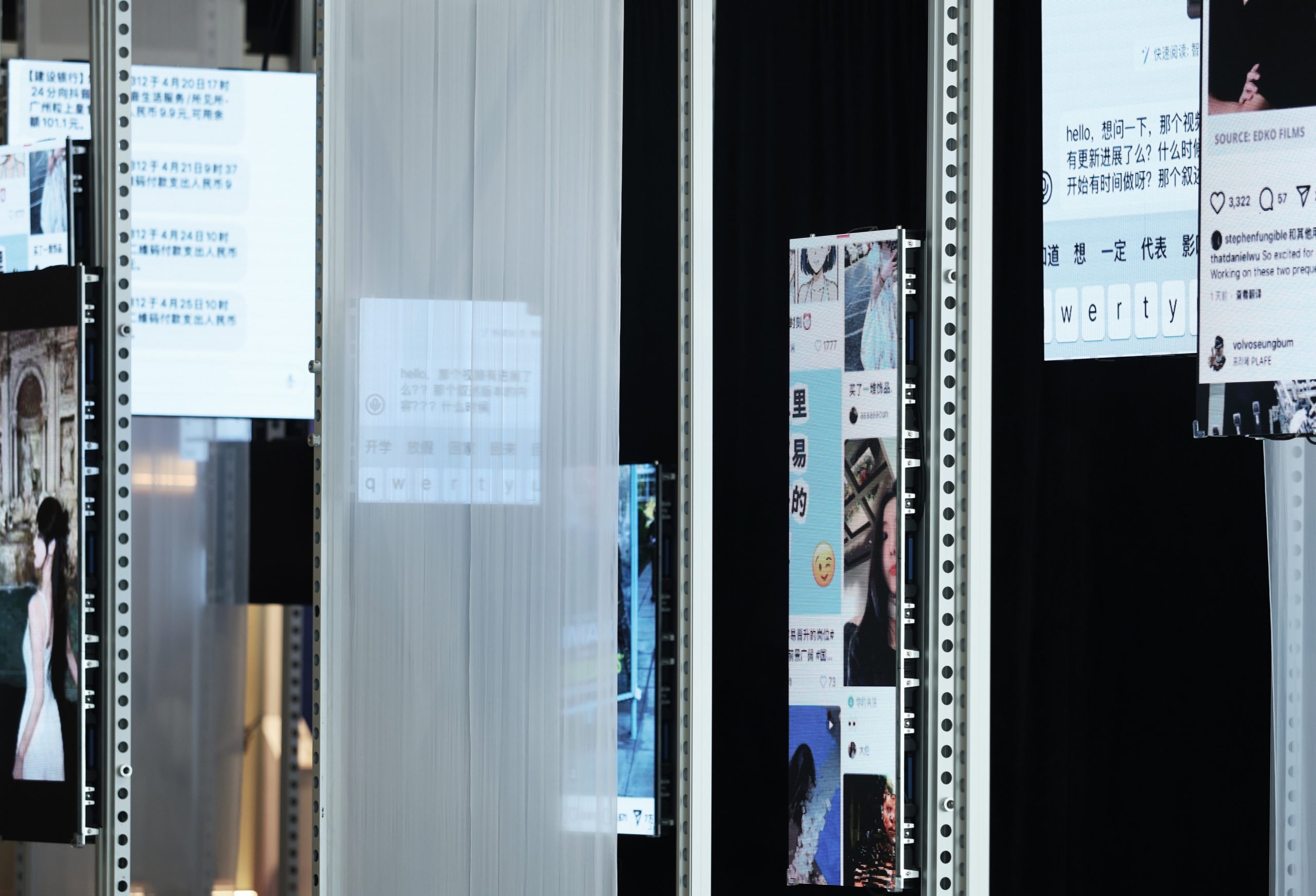 The dynamic content displayed across 198 uniquely shaped LED screens originates from screen recordings of randomly selected visitors' smartphone interactions.