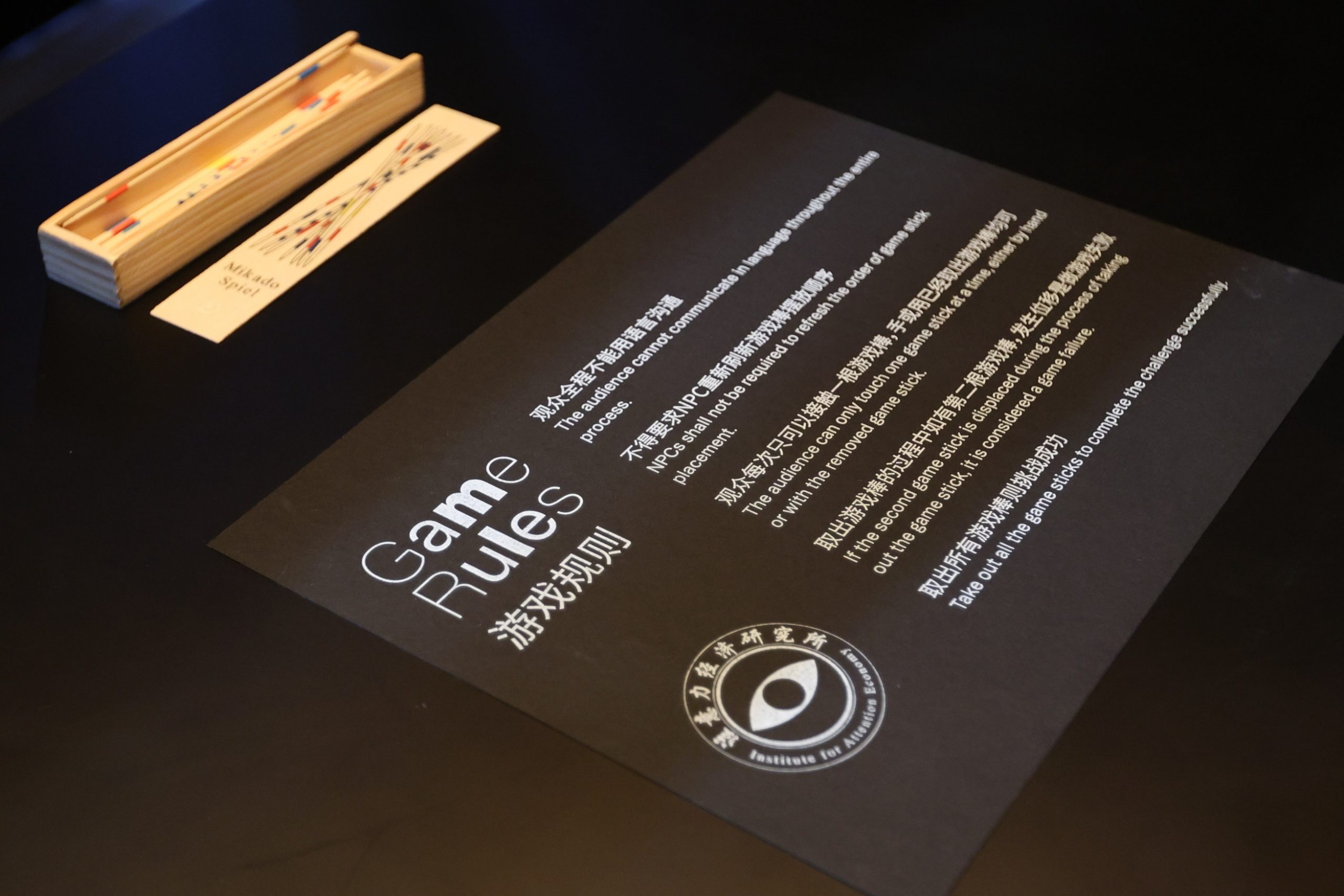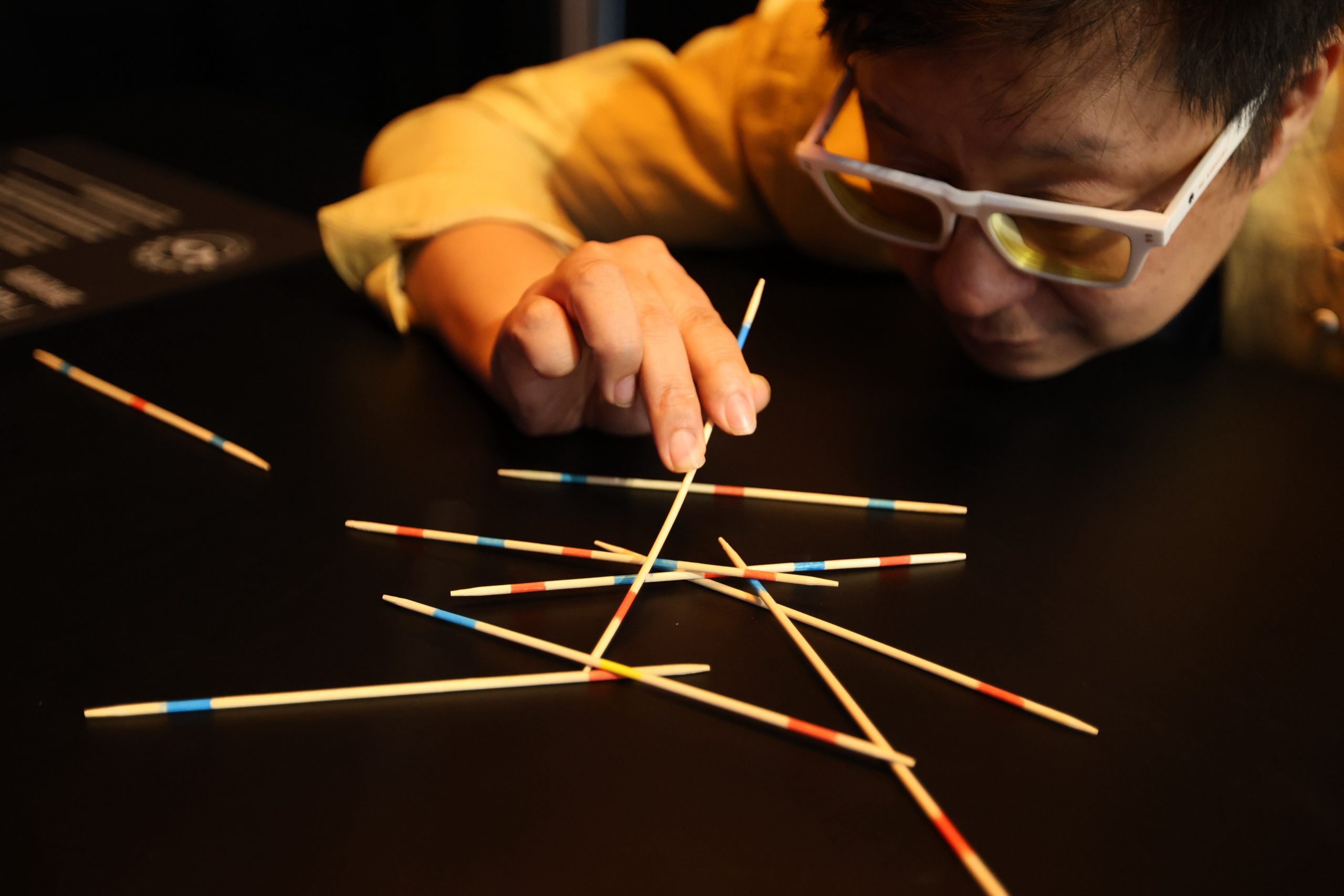 At the center of the space stands the "Pick-up Sticks" installation, a classic physical game from the 1990s that demands millimeter-precise hand control and sustained concentration.