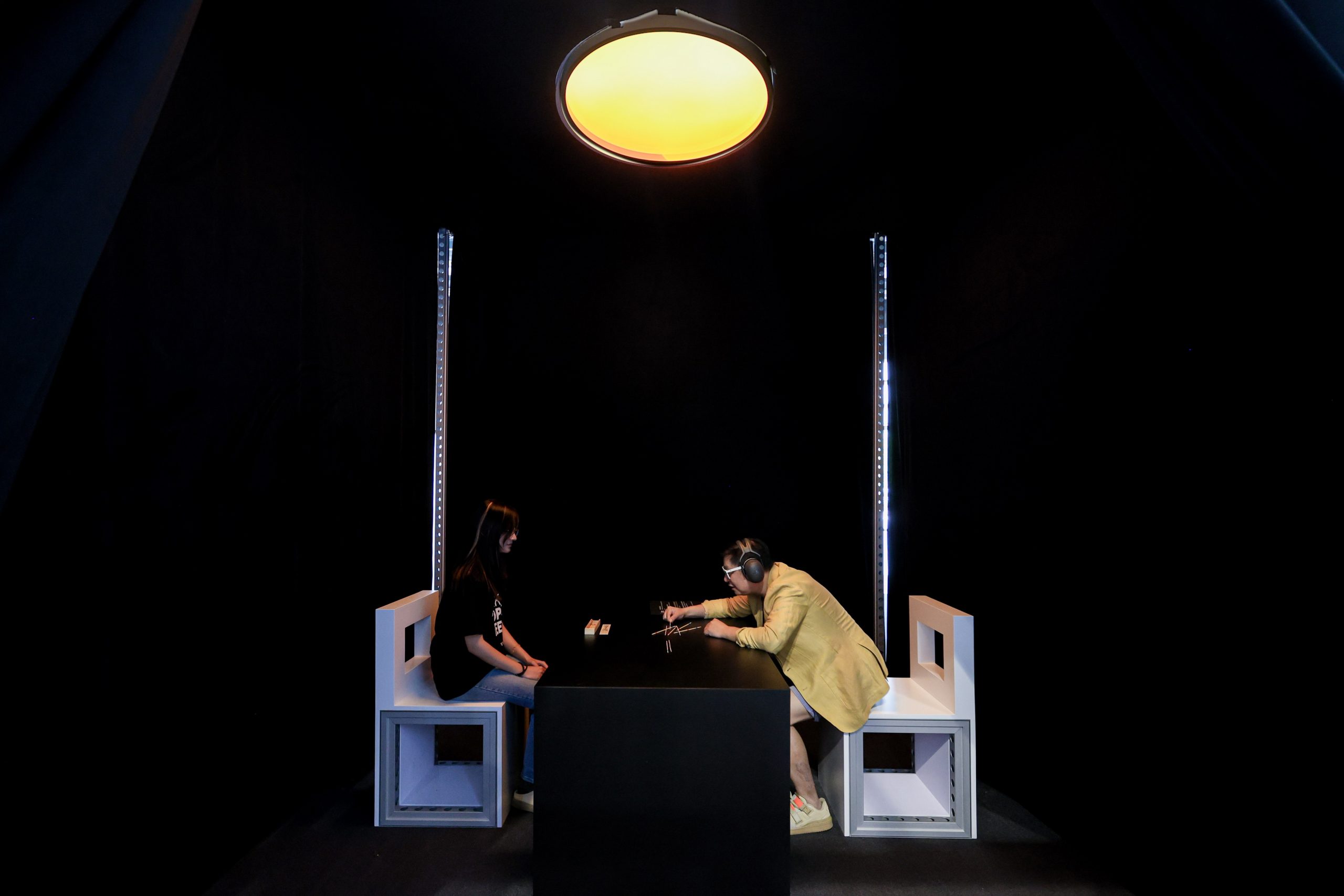 When visitors don the noise-cancelling headphones, the act of severing auditory connection with the outside world symbolically recreates digital natives' daily struggle against the information deluge, from enabling "Do Not Disturb" mode to using focus-enhancing apps like Forest, representing individual attempts to seek self-preservation within the technological framework.
