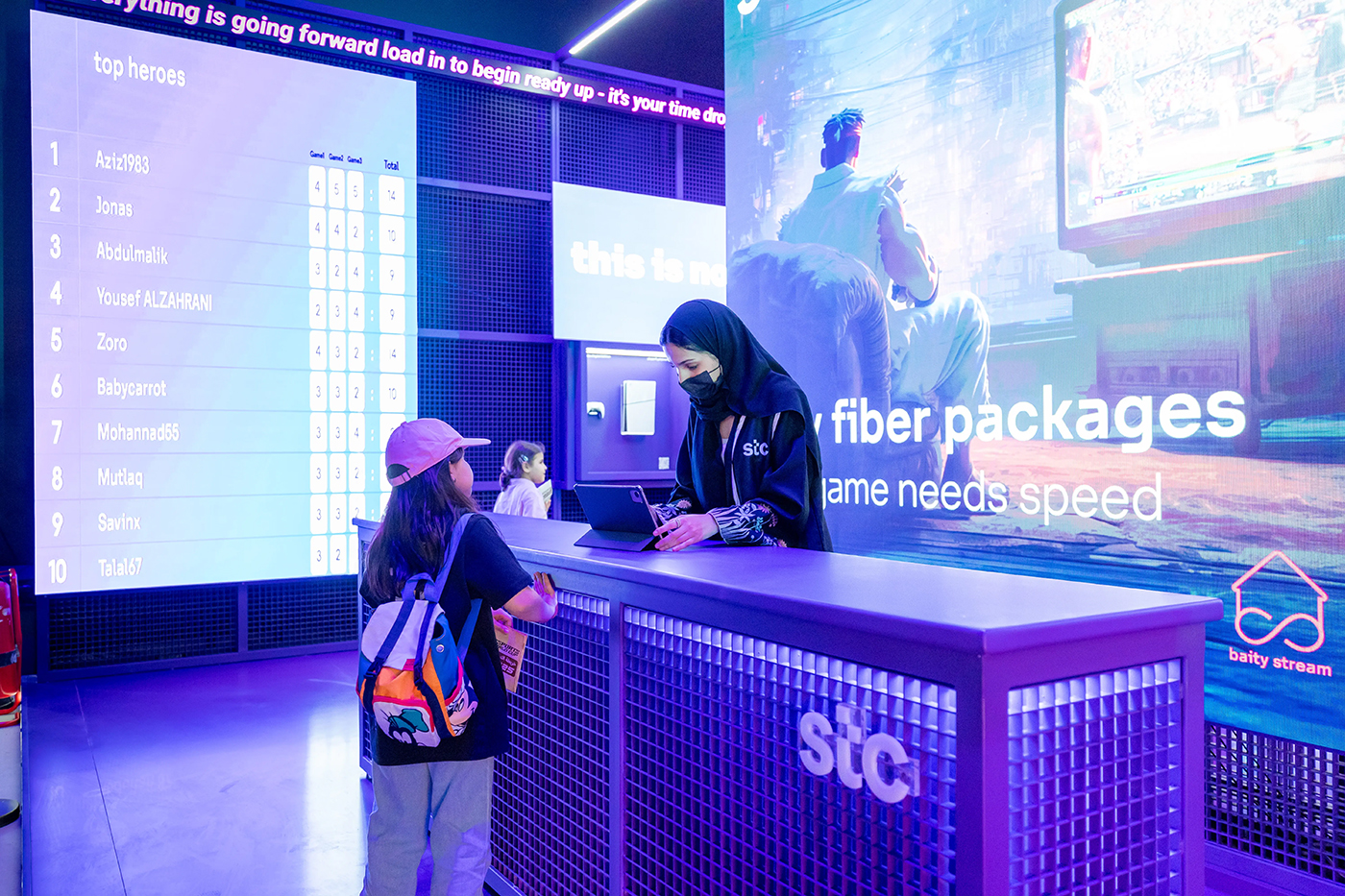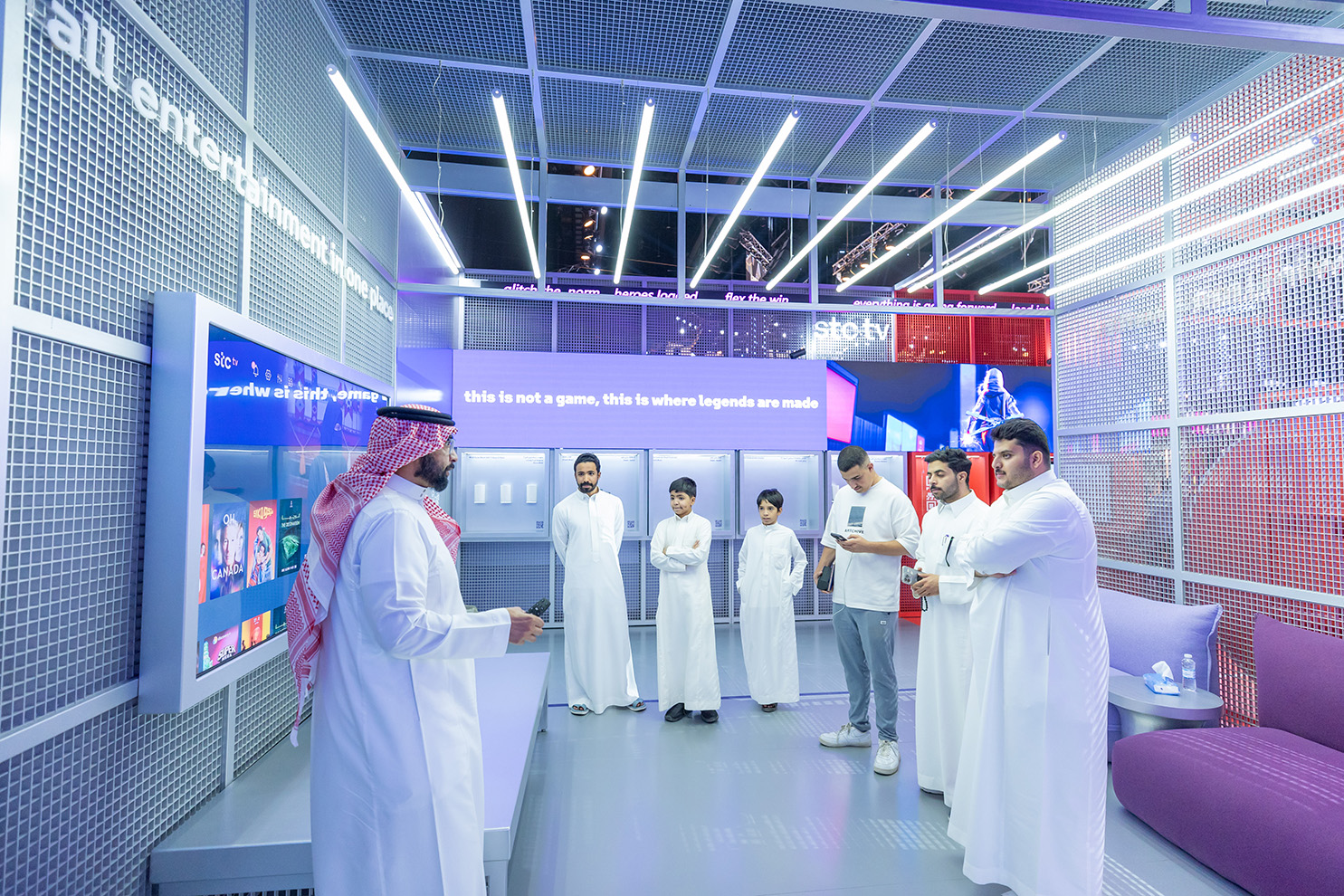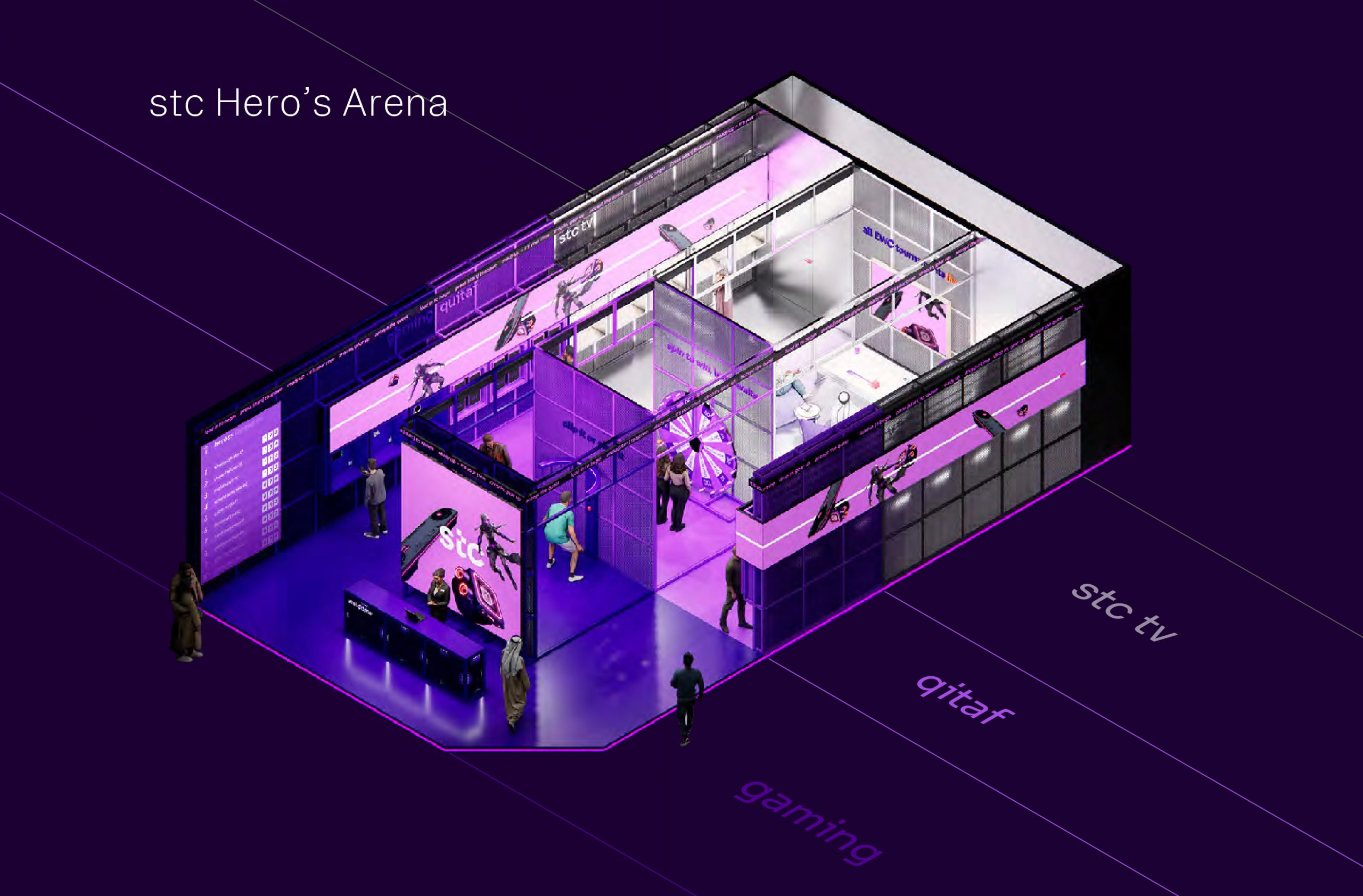 a high-energy playground locating in the central Gaming Hall, designed around three key zones, fast-paced Gaming zone, reimagined loyalty Qitaf Zone, and smart living stc TV zone. Each space invited participation through real-time challenges, digital rewards, and physical engagement.